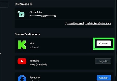 Connect your Kick account to your streaming software. If you are using Streamlabs, it’s easy to connect your account. Open the Settings menu and click Stream in the menu bar to the left. Then click Connect next to Kick and sign in to your Kick account. If you are using OBS, use the following steps to connect your account: Open OBS. Click Profile in the menu bar at the top. Click New. Enter “Kick” (or whatever you want) as the profile name and click Ok. Select “Optimize for Streaming” and click Next. Select your desired screen resolution and frame rate and click Next. Select “Custom” as the service. Copy the Stream URL from Kick.com and paste it in “Server URL.” Copy the stream key from kick.com and paste it in “Stream key.” Click Next. Wait for the test to complete and click Apply settings.