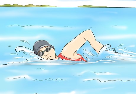 Swim with others. Swimming alone is risky, since no one will be able to help you in an emergency. Swim with a buddy or at least near other people.
