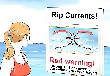 Pay attention to posted warnings. When you arrive at the beach, look for posted warning signs. If you are a weak swimmer or if there are no lifeguards on duty, you may want to avoid the water entirely on high risk days. Rip currents can occur in any conditions, but the warning signs give you a good estimate of risk. Some warnings are posted using this international flag system: Yellow: moderate surf or currents. Weak swimmers discouraged from entering water. Red: strong surf or currents. All swimmers discouraged. Two red flags: beach closed to swimmers. Red and white checkers: emergency evacuation. Two flags, each one half red and half yellow: the area between these flags is supervised by lifeguards. Swimmers should not leave these bounds.