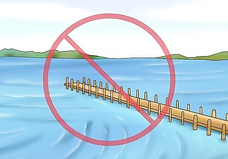 Stay away from structures that extend away from the beach. Permanent rip currents often develop near piers and jetties, so try to stay at least 100 feet (30.5 m) away from these structures. Long-lasting seasonal rip currents can also form around natural sandbars and rocky outcroppings that extend perpendicular from the beach.