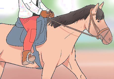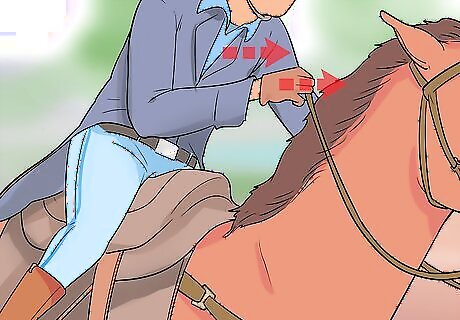 Move your hands and body forward, loosening the reins. While the horse's head is in the air, tilt forward to avoid falling backward and off of the horse. At the same time, relax your grip on the reins, both to avoid pulling back on them and also to eliminate 1 potential cause of the rear itself. Pushing your hands forward and toward the horse's mouth is a good way to loosen your grip on the reins while also tilting your body forward. Don't let go of the reins entirely; you'll want to make sure you're eventually able to regain control over the horse.
