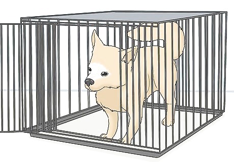 Confine your dog to a crate when you’re not around. If your dog tends to mark when you’re not home to supervise it, keep it confined in a crate or a designated area whenever you leave. This will prevent the dog from learning that it’s okay to mark all over the house when you’re away. If your dog isn’t crate trained, try keeping it in a small, easily cleaned room in your home, such as a laundry room, bathroom, or kitchen. Make sure the dog always has access to food and clean water, and provide toys to keep it busy.