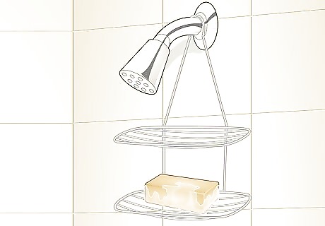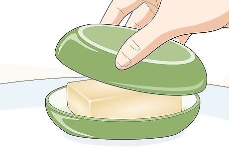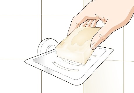Set the bar on a shower rack to help air circulate around it. Look for a rack that either hangs from the showerhead or one that attaches to the shower wall with suction cups. Make sure the rack hangs level, or else the shampoo bar could easily slip off of it. Put the bar directly on one of the grated sections of the rack so water can drain and air can blow around it. Many shower racks also have shelves or hooks so you can store other bottles of soap and hang washcloths. Since the shampoo bar gets smaller as you use it, it may become too small to hold on a shower rack.