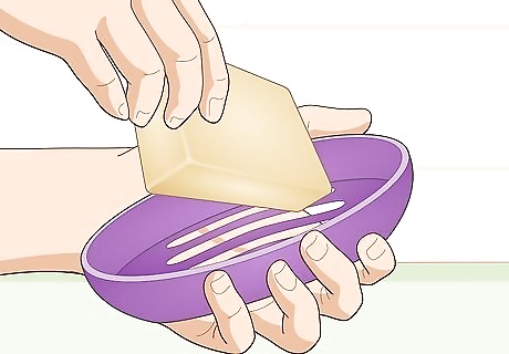 Opt for a soap dish with slats or grooves to help water drain out. Avoid using a soap dish that has a flat bottom since it will hold standing water and make the shampoo bar turn mushy. Set the soap dish on the side of your tub or a shelf in your shower so it’s level. Place the shampoo bar on the raised section of the soap dish so it doesn’t rest in any water. You can buy soap dishes from home goods stores or online. There are many styles of soap dishes, such as plastic, ceramic, and bamboo, so choose one with a design and color you like.Tip: If the soap dish feels wet before you put down the shampoo bar, wipe it dry with a washcloth or paper towel.