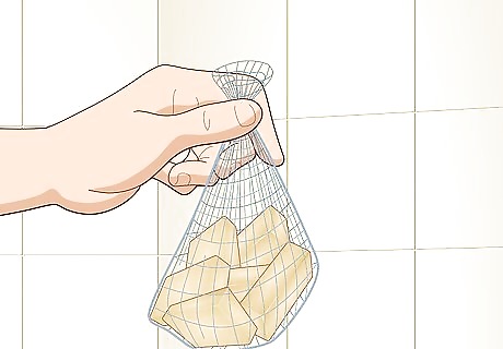 Hang the soap in a mesh or cotton bag if the pieces are too small for a rack. Look for a thin mesh or cotton soap saver bag at a specialty soap and cosmetics shop or online. Put the shampoo bar pieces into the bag and pull the drawstring tight so they can’t fall out. Secure the back to the shower curtain rod or from a hook in your tub so water can drip out. If you don’t have a cotton or mesh bag, you can also use a clean sock. If the bag gets dirty, put it in your washer on the delicate cycle.