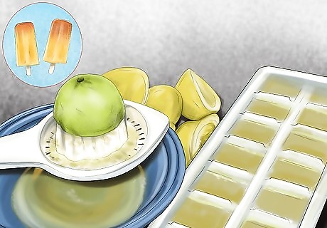 Freeze fresh citrus juice. Cut open fruit and squeeze juice into ice cube trays to make popsicles or add to meals for additional flavoring. Use frozen lime juice to preserve guacamole or any other dishes with avocado to keep it from spoiling. Frozen lemon juice can be added to fish before baking for a delicious citrusy taste. Frozen orange juice popsicles are a great way for kids to get their much-needed serving of vitamin C.