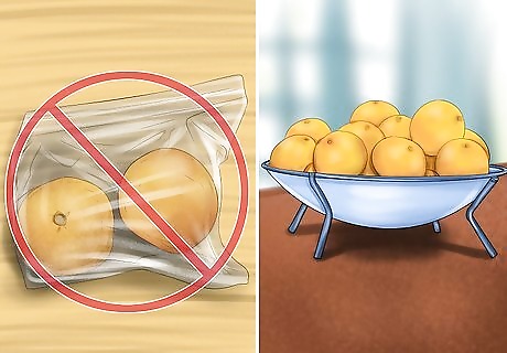 Keep them dry. Damp oranges that have been stored may quickly become moldy. Ensure that there is no moistness or water droplets on the skin of the fruit. If they arrive damp, so be sure to towel dry and air them out before storing.