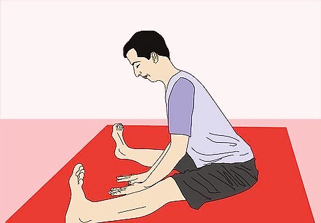 Straddle. Sit in a straddle and put your hands and arms out in front of you. Try to scoot and reach your hands out in front of you as far as you can and try to push your chest and shoulders towards the ground. As you do this, try to keep you feet turned out, knees and toes pointed back (not flexed feet). Don't bend your knees, or else you are not stretching the proper muscles. It is ideal to be flat against the ground, but you won't be able to do that at first. Hold this for 30 seconds, making sure to breathe deeply to get oxygen to those muscles! You also want to go over and hold 30 seconds each leg and also put your nose to your knee for 30 seconds each leg.