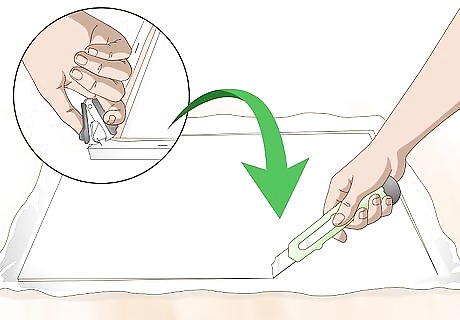 Pull out the staples and cut the paper. Use a staple remover to take out the staples. Pull the paper off the frame, and cut it at the fold. The paper is ready to be used for painting.