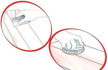 Scrape the entire surface with your scraper. You can use a stiff cleaning brush with natural bristles or a heavy cleaning sponge to strip wood finishes in grooved areas.