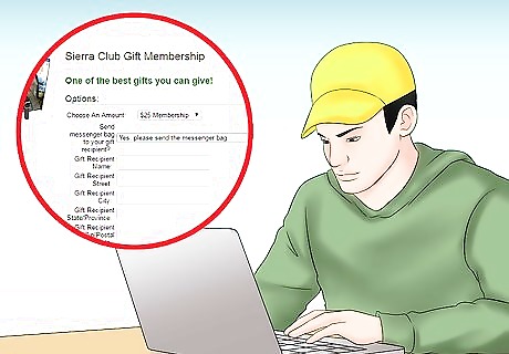 Give a gift membership. Regardless of whether you want to join Sierra Club yourself, the organization provides the option of purchasing a membership in someone else's name. You will have to have the full name and mailing address of the person for whom you're buying the gift. Gift memberships are $25, and include a messenger bag and a subscription to the organization's monthly magazine. Keep in mind that gift memberships, like regular memberships or other donations to Sierra Club, are not tax-deductible.