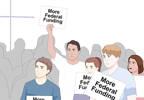 Protest in public to ask for more federal funding. Join up with other like-minded individuals to protest a lack of support for the arts in a public area. Try to center this protest around an upcoming legislation or a physical event, like the demolition of an art gallery. Protesting in a public place helps to generate interest for your cause. Make sure to be respectful throughout a public protest. Many successful protests have created change through their peacefulness.