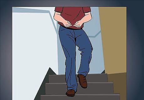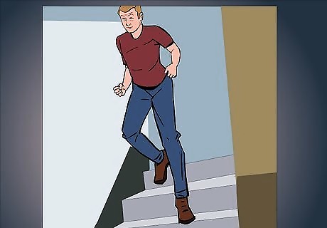Take the stairs to exit the building unless the stairwell is filled with smoke. Use the handrail to guide you and to help you keep your footing. If heavy smoke chokes the stairwell, you have no choice but to get to another exit or go back to your room. Do not try to rush through the smoke unless your return route is blocked. The smoke will probably be extremely toxic and you don't know what you will run into further down the stairs. If egress is impossible, go back to your room or up to the rooftop exit. If you find that flames or heavy smoke block your way after you have traveled down the stairwell, you can either try to get back to your room or get to the rooftop exit, if one is available. Not all stairwells have a rooftop exit, and even if you can get to the roof, be aware that the fire department may not have a ladder truck or helicopter readily available to reach you. What's more, the exit to the roof may be locked. If you checked it out earlier, you should know whether an exit is available. If you're not sure, try to make it back to your room, where you can either wait for rescuers or attempt to jump from the window. If you are locked in the stairwell, or if the path to your room is unsafe, hope that you can get out on the roof. Once there, close the door behind you to avoid creating a chimney effect that will draw fire and smoke upward more rapidly. Await rescuers on the windward side of the roof. Try to signal firefighters and wait for help to come.