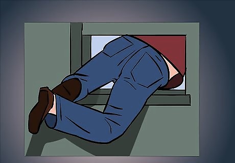 Climb out the window and jump if it is safe. If you have a ground-floor room, you can probably just climb out the window to safety. Remember you should not attempt to jump from higher than two stories unless your life is imminently threatened. You should also not jump if you can see dangerous obstructions below your window, or if there is a fire outside your window. If the conditions are right, and you are certain that you can not easily or safely exit the building through the halls, do not hesitate to use the window. Otherwise, wait as long as possible for rescuers to come before jumping from a window. If fire or smoke is present outside your window, close the window, tear down the curtains or drapes and move combustible objects away from the window.