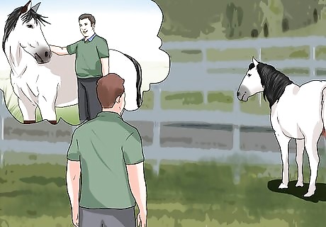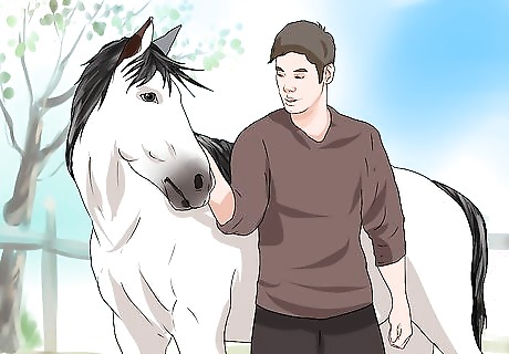 Stand beside the horse on the mounting side. Prevent your horse from getting spooked by standing on the mounting side. Most horses are trained to be handled on the near side (for mounting, catching, etc.).