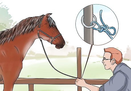 Tie up your horse securely. Ensure that the horse doesn't move around too much while you are taking his temperature. Tie him up to a wooden fence or post. Use a quick release knot so you can release him quickly if he gets spooked or agitated.