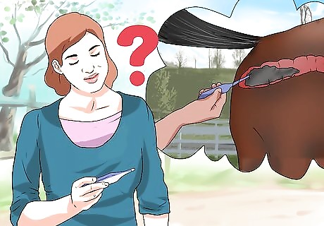 Call the vet if the thermometer slips internally. It is possible that the thermometer may slip entirely into the horse’s rectum. If this happens, call your veterinarian immediately. If the worst did happen and the thermometer slips internally, there is a chance it may be passed when the horse has a bowel movement. Call your veterinarian immediately, but monitor fecal output and check for the presence of the thermometer in the droppings. You can always cancel a vet visit if the thermometer comes out on its own.