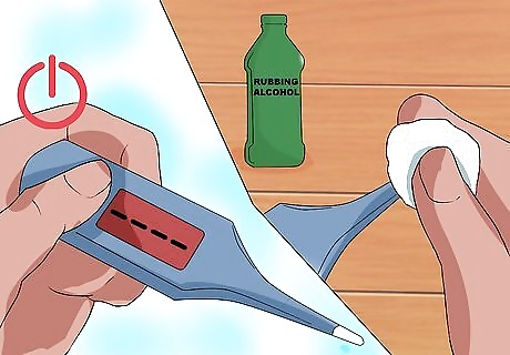 Disinfect the thermometer. Make sure the thermometer is turned off, or shaken down. Give the thermometer a good rub over with a disposable tissue or cotton wool. Soak a clean piece of cotton wool or tissue with rubbing alcohol and wipe it over the thermometer. This will disinfect the thermometer. Make sure to remove any manure which may have become attached to the thermometer.