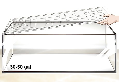 Choose a 30–50 US gal (110–190 L) plastic tub or aquarium with a lid. It is suitable to house smaller and younger garter snakes in smaller enclosures, while larger garter snakes require larger housing. Garter snakes are very active, so the enclosure needs to be big enough for them to move about. Ensure that the plastic tub or aquarium has a lid that is tight fitting. This is because garter snakes are known for being escape artists. A screen lid that snaps onto the enclosure is best. If the lid has any areas of mesh or grille, check that the snake won’t be able to climb through past its eyes, as this means that it will be able to fit all the way through the gap. An enclosure for 2 garter snakes should be approximately 55 US gal (210 L).