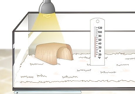 Use a heating pad and a light bulb to maintain the temperature. Garter snakes are cold-blooded animals which means that they need their enclosure to be 75–85 °F (24–29 °C) in order to survive. Place a heating pad below 1 side of the enclosure and install a reflector or incandescent bulb above it. Use a thermometer to monitor that the warm part of the enclosure doesn’t rise above 86 °F (30 °C) and that the cool part doesn’t drop below 72 °F (22 °C). This creates a temperature gradient which means that the temperature changes depending on the location inside the enclosure. The heating pad can be one specifically for reptiles or it can be a regular electric blanket that is set to the lowest temperature. It’s important to create a temperature gradient inside the enclosure. This allows the garter snake to move to a warmer area such as the heating pad if needed. It also lets the snake cool down in the cooler part of the enclosure. This is why the heating pad only warms part of the enclosure. A stick-on thermometer is an ideal way to get a good estimate of the temperature inside the enclosure. Temperatures that are above 91 °F (33 °C) can be dangerous for garter snakes. If the snake is moving quickly around the enclosure with its mouth open, this means that it is overheating. Immerse the snake in cool, running water and adjust the enclosure temperature to the appropriate range.