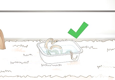 Choose a water dish that is big enough for the snake to curl up in. Garter snakes need a water dish to both drink water from and to soak in. Pick a bowl that is large and shallow. Make sure that the water dish in the enclosure is always filled with enough fresh water for the snake to soak. Change the water every day. A common misconception about garter snakes is that they are aquatic creatures. While garter snakes do soak in the water from time to time, they need an enclosure that has plenty of dry areas to stay healthy. It is only the prey of wild garter snakes that are aquatic.