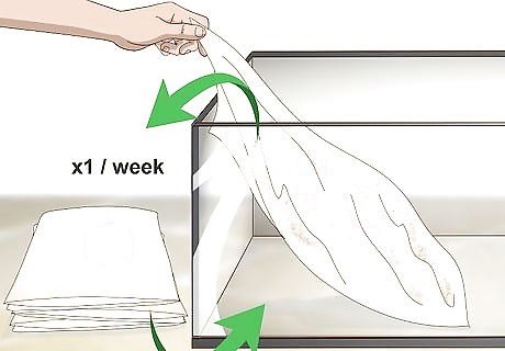 Change the substrate once per week if you're using paper towels. Remove the old substrate and discard it. Replace it with fresh, new paper towels. If the garter snake eats worms or fish, the substrate will need to be changed more frequently than if the snake is on a mouse diet.