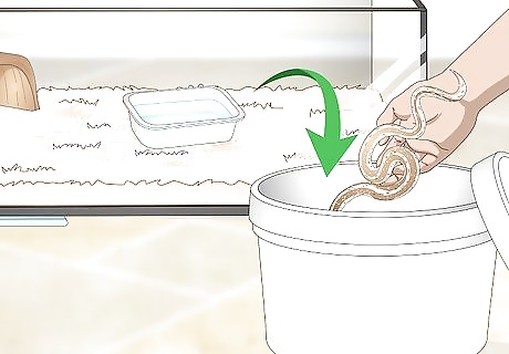 Remove the snake before you clean the enclosure. Transfer the snake from the enclosure and into a small, plastic container with a lid. Make sure that the lid has small holes so that the snake can breathe, but that the holes aren’t large enough for the snake to escape. If you cannot find a lid with holes, use an electric drill to create some.
