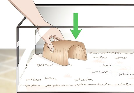 Add cage furniture to help the garter snake to feel more secure. Snakes require at least 1 dark space to hide in within their enclosure. You can use plastic bowls, cardboard boxes, toilet paper tubes, or specialty snake hide boxes that can be purchased from pet stores or online. Cage furniture such as fake or real plants, wood, rocks, and decorations can also be good additions to the enclosure as the snake will enjoy exploring the objects. Aim to have the opening to the hide box just slightly bigger than the width of the snake. It needs to be large enough for the snake to fit in, yet small enough so that the snake can feel enclosed and safe.