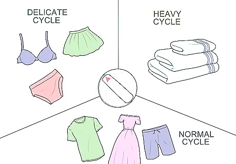 Pick a cycle for the size and strength of your clothes. Washers usually have a lot of options, and you can choose based on what you’re washing and how large the load is. For delicates and small loads, you can pick a delicate cycle. For towels and blankets, you can choose a heavy cycle. For everyday clothes, pick a normal cycle. Using cold water to wash your clothes uses less energy than hot water does.