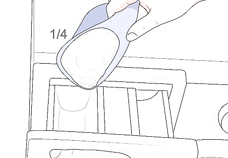 Use about 1/4 of a capful of laundry detergent. For a typical large load of laundry, you don’t need a lot of detergent. Fill up the cap of the detergent about 1/4 of the way, then dump it into your detergent tray if you have one or straight into the washer if you don’t. Using too much detergent can cause soap residue to build up in the washer, making it less effective.