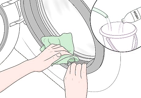 Clean your washer’s gasket and drum once a month with vinegar. In a large bucket, mix equal parts of warm water and white vinegar. Dip a damp rag into the solution, then use it to scrub the gasket and the drum. You can also use this solution to clean the exterior and detergent dispenser, if your washer has one. Vinegar is a mildly acidic cleanser, so it works to kill mold and mildew.