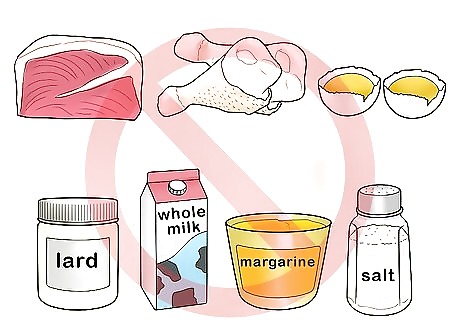 Avoid foods that increase your cholesterol. One of the most effective ways to lower your cholesterol is to eliminate high cholesterol foods from your diet. Foods that should be avoided include: Fatty cuts of meat Poultry with the skin on Whole-milk dairy Lard Egg yolks Margarine or shortening high in trans fat Salt