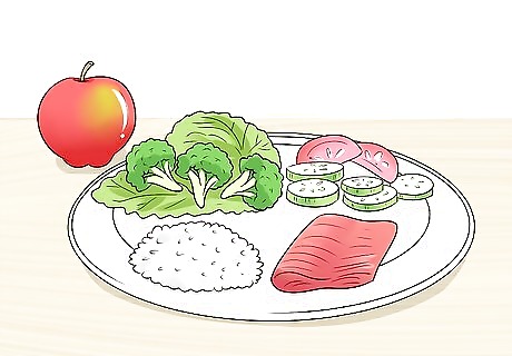 Eat foods that will reduce your cholesterol. Focus on eating only healthy fats, such as those contained in leaner meats, low-fat dairy, and healthy oils, such as olive and canola oil. You should also increase the amount of omega-3 fatty acids and soluble fiber that you eat, as these can help lower your bad cholesterol levels. Overall, your diet should consist of a balance of fruits and vegetables, whole grains, and low-fat proteins.