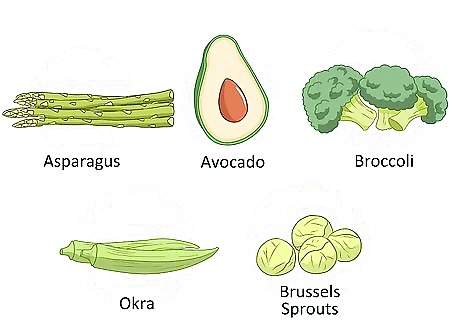 Add green vegetables like asparagus and broccoli to your diet. Although they’re not leafy, other dark green vegetables are typically high in folate as well. These include foods like asparagus, avocado, broccoli, okra, and Brussels sprouts. 1 cup (237 grams) of cooked okra contains 206 mcg of folate. The same size serving of avocado contains about 100 mcg of folate.
