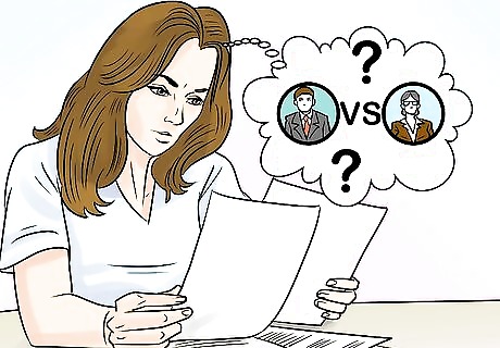 Compare and contrast several attorneys. After your initial consultations are over, sit down and go over the information you have about each attorney with whom you spoke. You can create a chart to compare the attorneys objectively. The items on your chart will depend on what's important to you and what differentiates the attorneys you interviewed. For example, if all the attorneys you interviewed would work on contingency, fees may not be an issue – unless one has a significantly higher fee percentage than the others. Objective criteria are important in comparing attorneys, but don't be afraid to go with your gut. Your personal feelings and comfort with your attorney may matter just as much as their experience. For example, suppose you talked to one attorney who had less experience but who made you feel comfortable, expressed interest in your case, and seemed passionate about their work. They may be a better representative for you than another attorney with significant experience who was cold and intimidating.