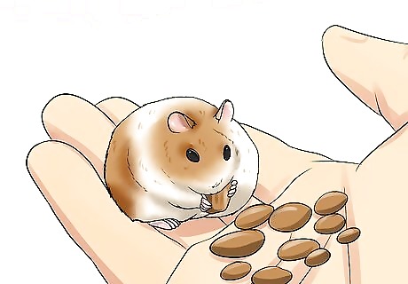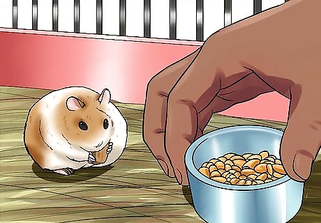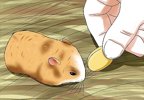 Hold the treat in your hand. Once your hamster is comfortable with your hand, leave the treat in your hand and wait for the hamster to come to your hand. Do not wiggle your fingers around or try. The hamster should not have to climb all the way onto your hand to get the treat. He should be able to reach the treat with his paw.