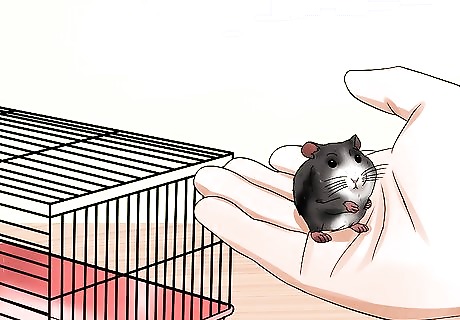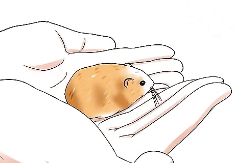 Cup the hamster in the palm of your hand. Place your hand in the cage and allow the hamster to walk into your hand. Once he is in the palm of your hand, place your other hand on top of the hamster to create a little cave. Make sure his head is sticking out. Hold the hamster a few inches above the ground while he is still in his cage. Avoid picking him up with your hand. Always allow him to walk into your hands when he is ready. Never approach your hamster from behind. He cannot see you, and this will scare him. Your hamster may try to jump out of your hands at first. Your hamster may urinate because he is nervous. Do not drop him or get upset with him. Talk to him in a calm tone and say, “It’s ok. I know you are a little nervous.” Gently place him back in his cage and try again later.