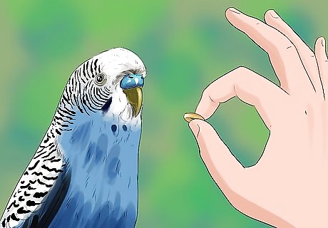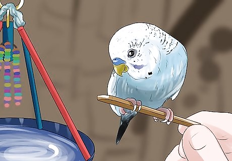 Start training. Try a bead on a string. Sunflower seeds work well too. Just wave the bead/food around your budgie and they will try to catch it. When they do, give it a treat.