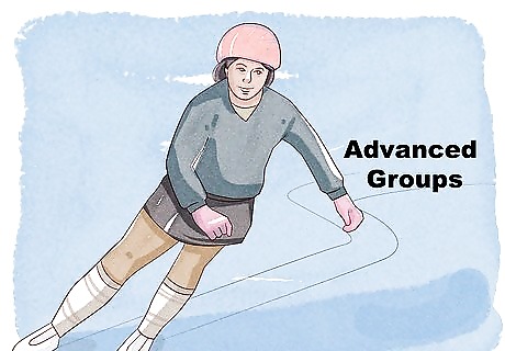 Have advanced groups practice drills and speed games. Advanced level groups generally can glide and stop well, can transfer their weight between skates easily, and can move backwards. Drills like suicides and speed games like relay races work well with this group. They may also enjoy playing soccer on ice and keeping a balloon in the air from 1 end of the rink to the other in small groups. For basic suicide drills, set up cones at the corners of the rink and have students sprint-skate to each cone, stop, then go the next cone. Stagger students in pairs to prevent colliding. Continue for 10 minutes or until each student has done 5-10 laps. Other games for this group include red light – green light and obstacle courses that include jumping.