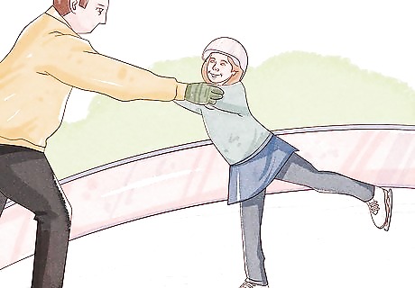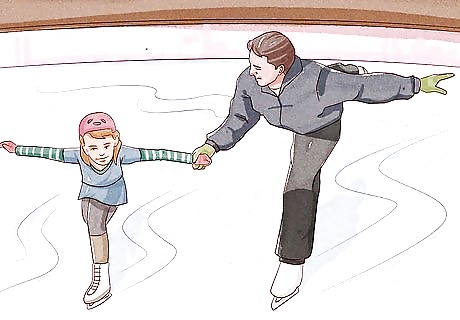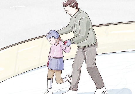 Practice small steps. Have your child lift 1 foot, put it down, then lift the other foot. This helps give them a sense of the blade on the ice and shifting their weight. Have them bend their knees and keep their hands out in front and pushing down, as if pushing on an invisible table, to maintain their balance. Stand to the side or in front of your child with your hands under both their hands. Avoid holding just 1 of their hands, as it may throw off their balance.