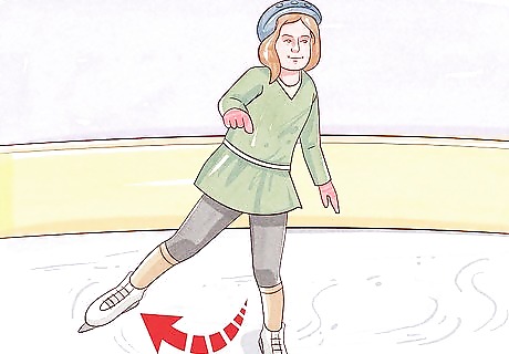 Show them how to stop. While standing with their feet together, show your child how to push out the inside edge of each blade to get a feel for shaving the ice, or scraping the ice surface with the side of their blade. Tell them that this is what they will do with 1 foot while stopping. Have them go into a slow glide, then bend their knees and bring their toes to an inverted “V,” while putting their weight on 1 foot and shaving the ice to stop with the other. Have your child push down with their hands, as if pushing on an invisible table, to maintain their balance while practicing stopping.
