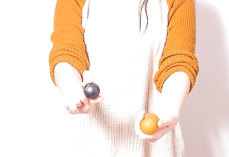 Choose the right object. Using the right juggling ball makes all the difference when you're getting started. Using a solid ball will frustrate the student because it will roll away when they drop. Similarly, a ball that bounces can be mayhem for the beginner. For this reason, choose a beanbag or beanball that will stay put when it is dropped. Choose the weight carefully. Anything over 8 ounces (226 g) will become really heavy after prolonged juggling. Something that is too light will also be difficult to juggle. It will help if the objects are brightly colored and contrast with themselves and the surroundings. If you need lots of props for a larger class, see how to make balloon juggling bags, how to make juggling balls from tennis balls, and how to make your own juggling clubs.