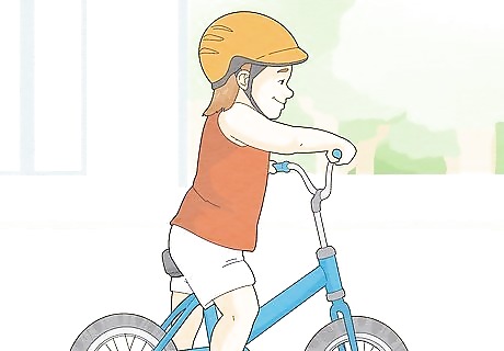 Play games that encourage good posture. There are a variety of games you can play with your child that promote good posture. Be creative and have fun to help your kids learn. Play "My Fair Lady," a game in which kids have to walk across a room carrying a book on their head without having it fall off. Kids will have to learn how to stand up properly and position their head and neck in such a way that promotes posture. Encourage climbing. Have your children climb trees or buy climbing nets, climbing domes, or even ladders. Climbing requires a certain amount of core stability and strength that will encourage good posture. Take your kids on bike rides. The way you need to sit on a bike to find balance results in good posture.