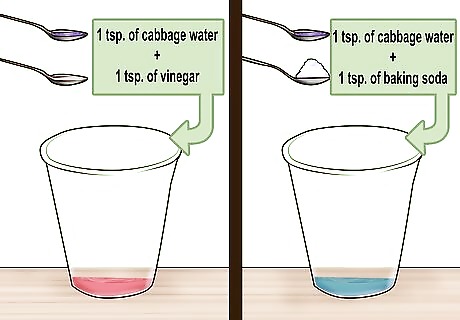 Test the indicator. To make sure the indicator is working properly, you can test it using baking soda and vinegar. Put 1 teaspoon (~5 mL) of the cabbage water into two small, clear glasses. Add a teaspoon of vinegar to one glass and a teaspoon of baking soda to the other. Vinegar is acidic, so the water will turn pink. Baking soda is basic, so the water will turn blue.