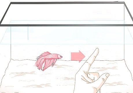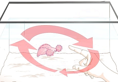Teach your fish to follow your finger. Drag your finger across the front of the fish tank (never keep a betta in under five gallons, it is unethical and cruel). If they move towards it, reward them quickly with a treat. If they do not notice you, shake your finger until they notice. Move your finger in multiple directions. First, move your finger to opposite sides of the tank. Next, move your finger vertically up and down. Reward your fish each time they follow you. Train them for three to five minutes at a time over several days. Proceed to other tricks once they consistently follow your finger. Once your betta can follow your finger, teaching other tricks will be easier.