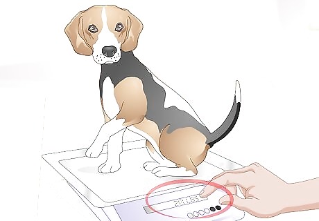 Assess your dog's weight. A puppy that is overweight may need to be switched off of puppy food sooner than expected. A puppy that is underweight may need to stay on puppy food until it gets its weight up. Discuss your dog's weight with its veterinarian and come up with a plan to get the dog to an ideal weight. This could be done by switching the dog to adult food, giving it fewer meals each day, or simply lowering the amount of puppy food it gets. Most often, your puppy will be weighed when it goes to the veterinarian. Your vet will tell you its weight and whether that weight is within a normal range.