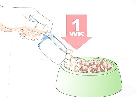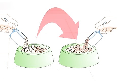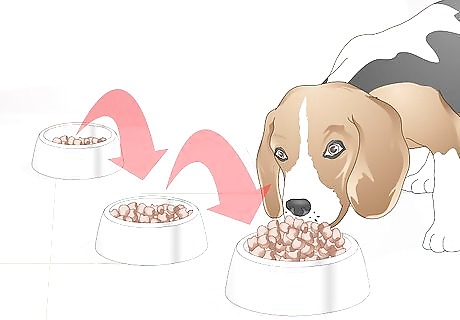 Adjust the frequency and amount of food your dog is receiving. Once your dog is on its new adult diet, you will need to adjust the amount of food that it is receiving. The new food will have a different caloric content and you will need to take that in to account. To begin with, follow the directions on the food packaging, which usually suggests a serving size based on your dog's weight and age. As with the type of adult food you are feeding your dog, you can discuss serving size with your dog's veterinarian. They should be able to suggest how many calories your dog should be eating per day.