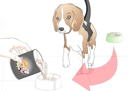 Try a different food if necessary. There is the chance that your dog will simply reject the new dog food that you have chosen. If your dog refuses to eat the new food, even when mixed with the old food, then you may need to find a new dog food. Many dogs refuse a new food because they get attention when they refuse to eat. Put the food down and leave the room for ten minutes. Then come back and throw any uneaten food away. Don't give your dog anything else until the next meal. At the next meal, repeat the process of putting the food down and leaving the room. This is common if you are trying to transition between wet and dry dog food. A dog that is used to one or the other may have a hard time eating a different consistency of food. In general, however, wet food is often more palatable to dogs and you may have a hard time getting your dog to eat kibble once it has eaten wet food.