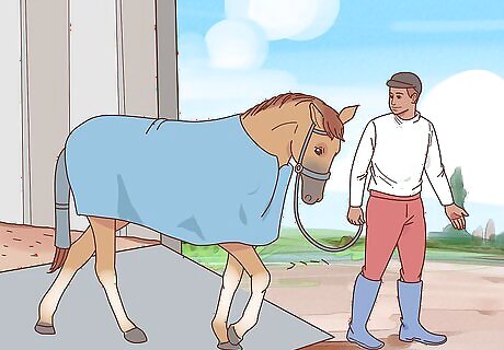 Stop every 12 hours on longer trips to put your horse up for the night. If you’ve got a long road ahead of you, veterinarians recommend pulling over after about half a day’s worth of travel time to give both you and your horse a much-needed break. Allow your horse to rest for at least 8 hours before you head on to your next stop. Plan your overnight stops in locations where you can rent a stall at a commercial stable. Horses experience travel exhaustion just like people do. If you find yourself feeling fatigued after a lengthy drive, chances are your horse is, too.