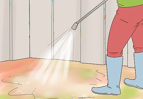 Sanitize your truck or trailer thoroughly after arriving at your destination. Start by sweeping the leftover feed and soiled bedding material into a trash bag to discard separately. Pull up any removable floor mats, along with leads, haynets, and other loose fittings. Spray the floor, walls, and ceiling of the interior compartment with a power washer on a low pressure setting, then scrub them with a stiff-bristled brush and disinfectant soap while they're still wet. When you're done, rinse all exposed surfaces with your power washer. For health reasons, it's important to wear thick work gloves, a face mask or respirator, and protective long-sleeved clothing, especially if your animal has recently been sick. Always sanitize your transport within 24 hours of unloading your horse.